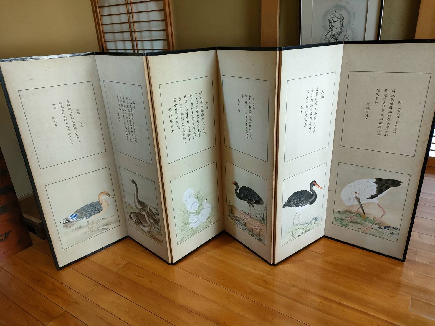 その屏風は鳥たちが生き生きと描かれたもので、繊細な筆運びと美しい構図から、ただの装飾品ではない気配が漂います。墨で綴られた漢詩は、絵と共に静かな世界観を作り上げ、見る者の心を引き込む力を持っていました。