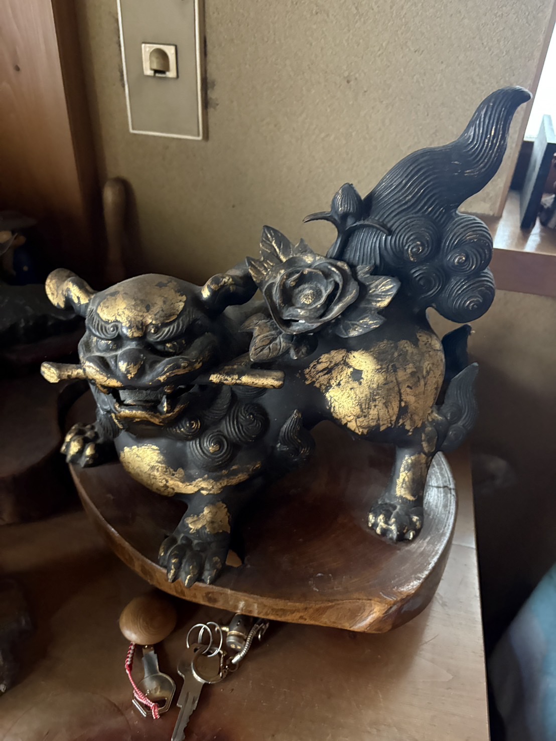 今回のご依頼は石川県内の旧家にて行われた蔵整理 買取の一環でした。お客様の祖父母が長年大切にしていた骨董品が多数あり、その中に写真のような金彩の獅子像がありました。