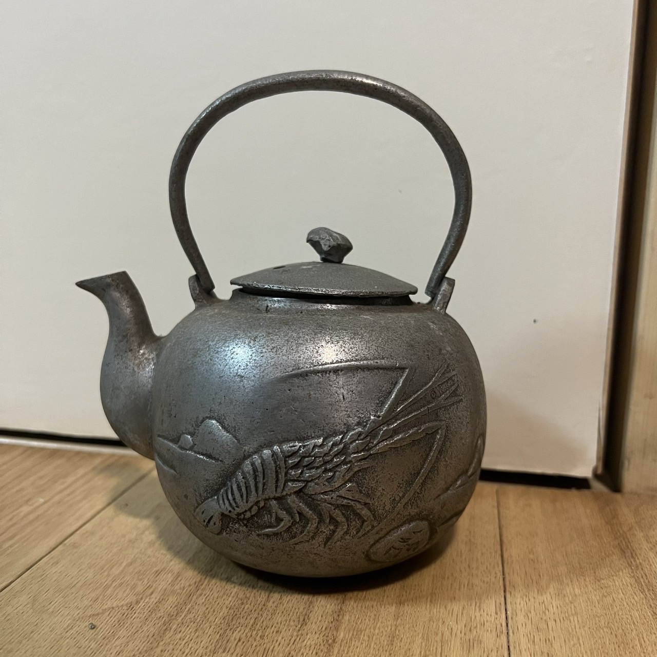 海老文様は縁起物として人気があり、さらに鉄瓶としての保存状態も良好であったため、高く評価しました。共箱や由来の記録はなかったものの、造形と意匠の力強さが市場で評価されるタイプの品でした。