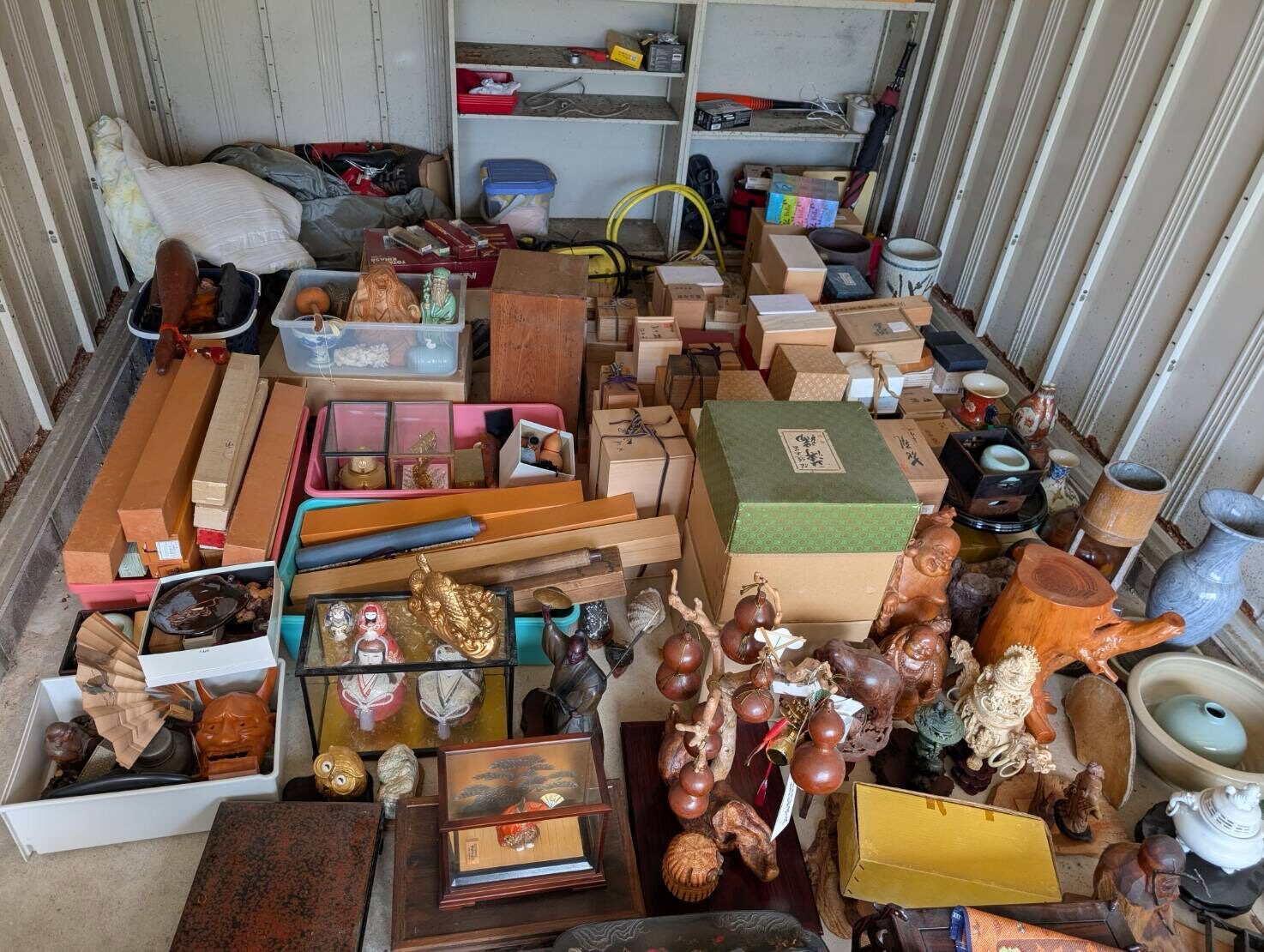 現場に伺うと、倉庫の一角には木箱やガラスケース、陶器、木彫の置物、仏像、ひょうたん飾り、漆器、掛軸の箱が積み重なっており、まさに骨董品の宝庫といえる状況でした。