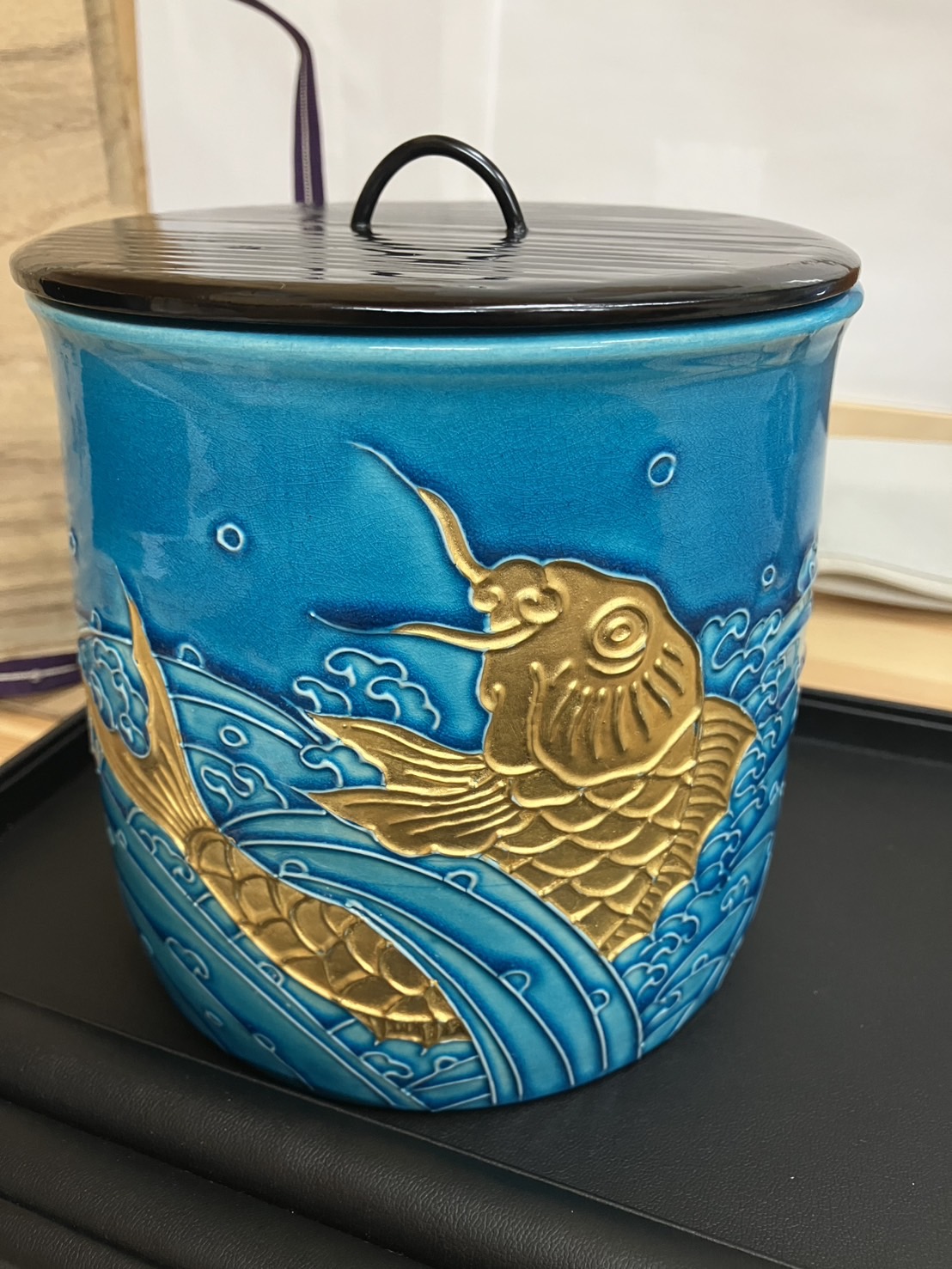 鮮やかな瑠璃色の釉薬に、金色の鯉が力強く描かれた作品で、見る者の目を奪うような迫力と優美さを兼ね備えています。