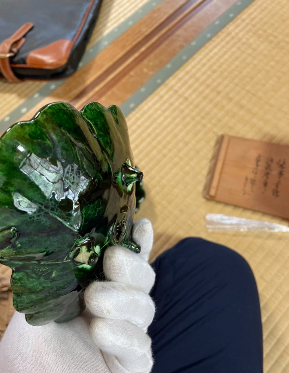 座敷に通され、桐箱から大切そうに取り出されたのが今回の陶器でした。箱を開けた瞬間、光沢のある深緑の釉薬が目に飛び込んできました。葉脈を思わせる立体的な造形に、釉薬の流れが自然の景色を生み出していました。