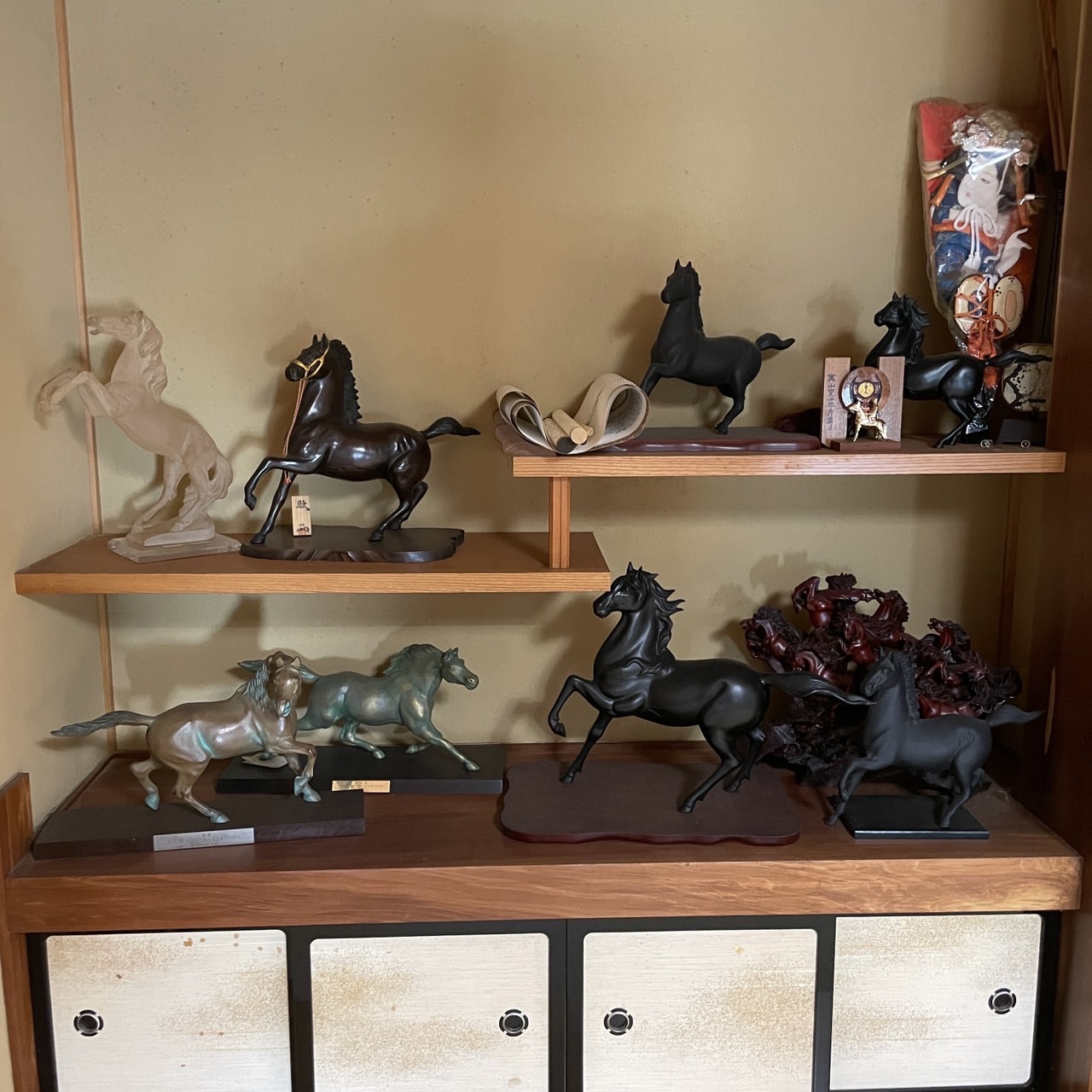 今回お預かりしたのは、木棚に飾られていた複数の馬の置物です。素材はブロンズ、陶製、石膏風のものなどさまざまで、それぞれの作品に作者の意匠が込められていました。黒光りするブロンズ像は躍動感に溢れ、白い立ち馬の像は優雅な佇まいを見せ、茶褐色の作品は落ち着いた古典的な雰囲気を漂わせていました。