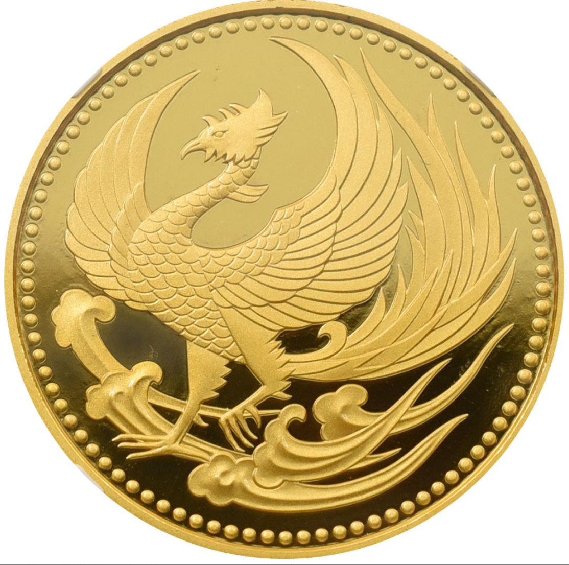 平成2年(1990年)、平成天皇(今上上皇陛下)の御即位を記念して発行された純金の記念硬貨です。