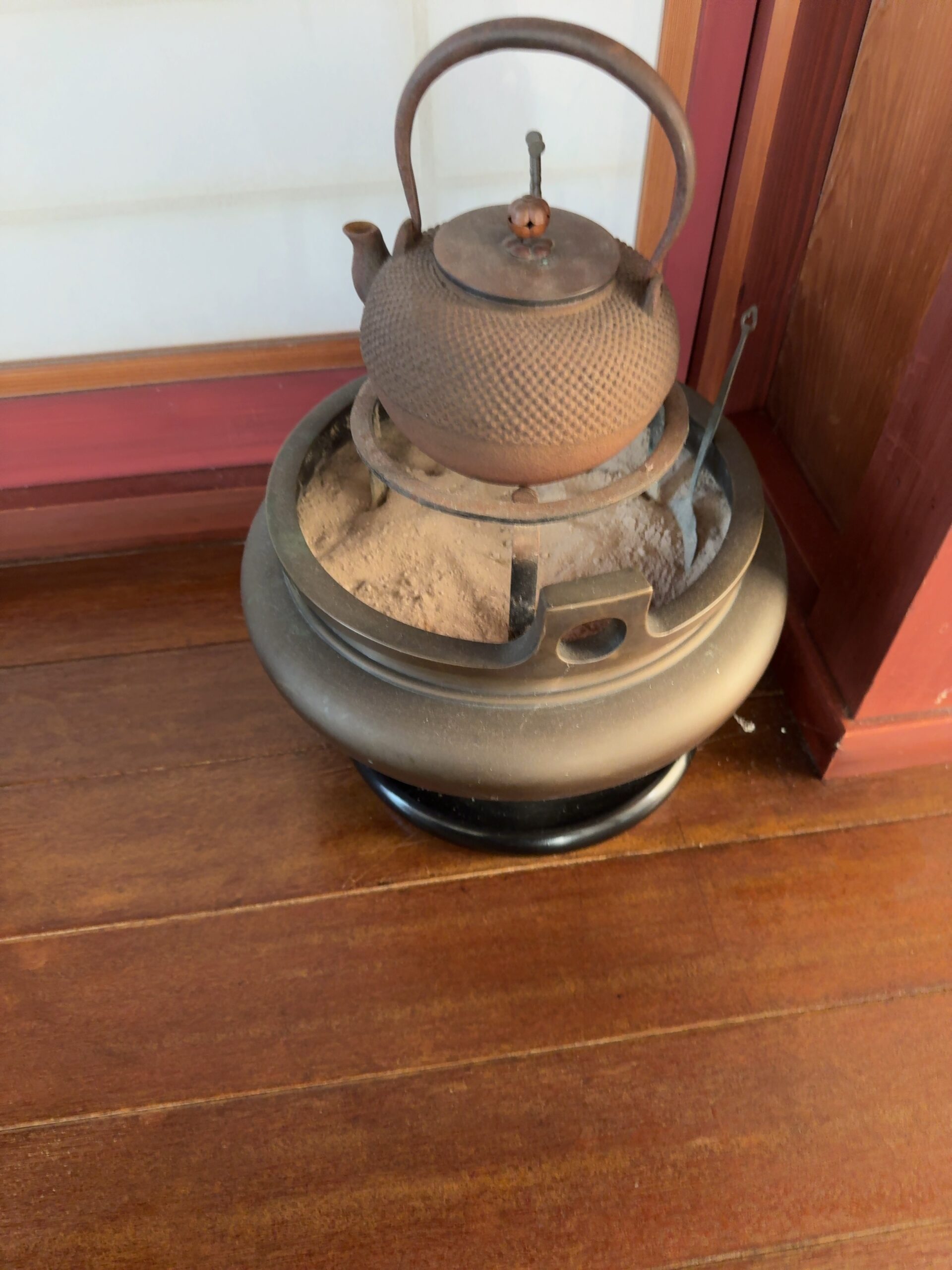 そんなお問い合わせをいただき、小松市のお客様宅に伺いました。蔵の一角に丁寧に保管されていた鉄瓶は、南部鉄器らしい重厚感を持ち、使い込まれた風合いが魅力的でした。火鉢は金属製で、内部に灰が残っており、今も使われていた様子が感じられます。