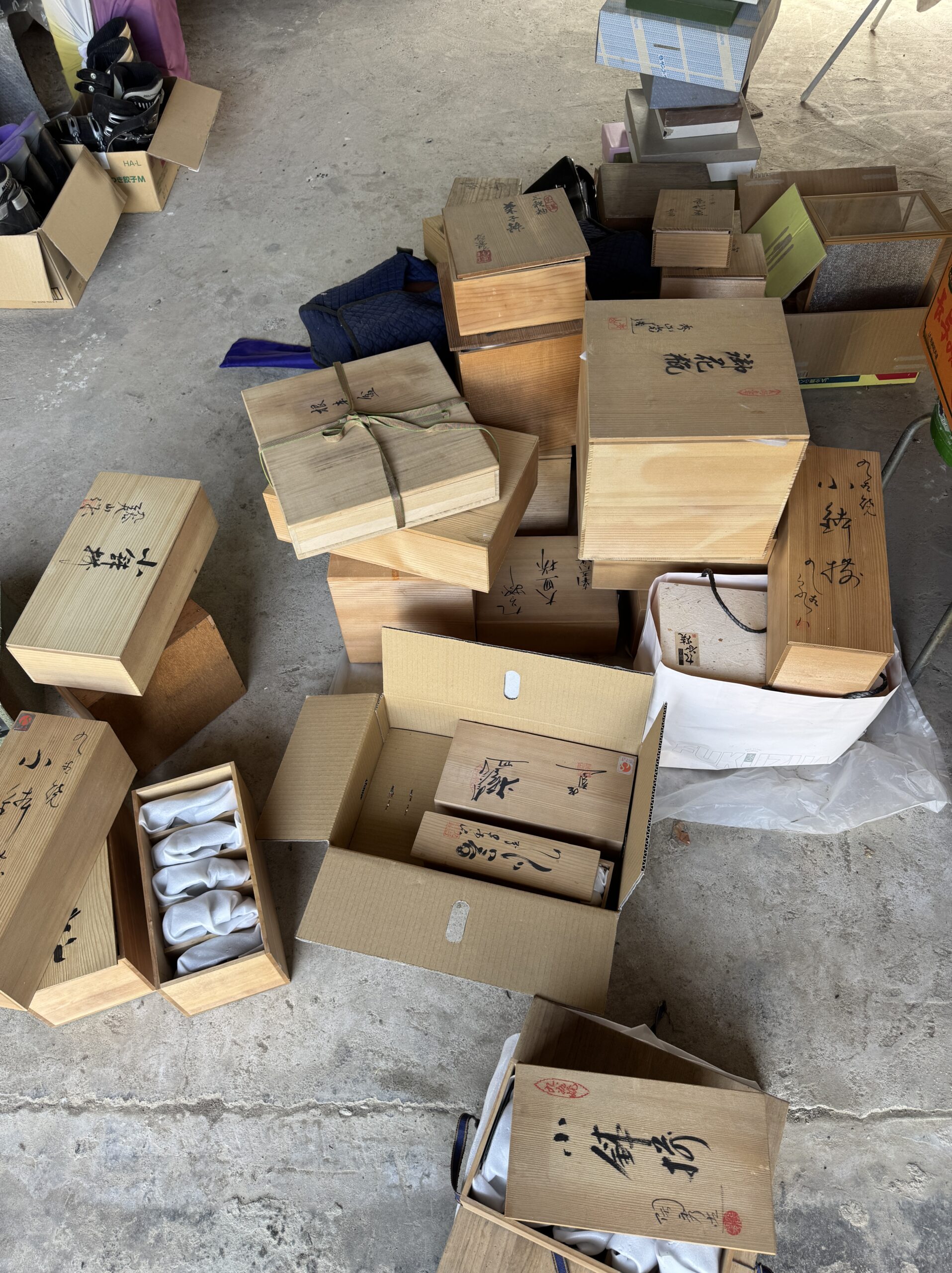 白山市のお客様の蔵にも、木箱に収められた湯呑みセット、茶碗、皿、鉄瓶、掛軸などが丁寧に保管されていました。木箱には作家名や落款が記されている場合もあり、価値を見極める大きなポイントとなります。