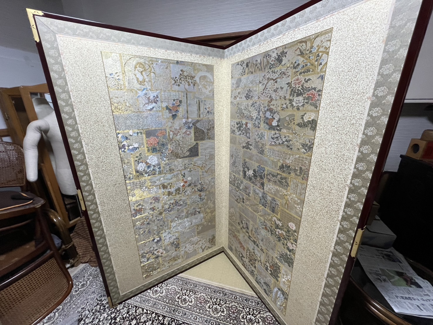 実際にお客様のご自宅にあった屏風も、細やかな絵柄がびっしりと描かれた、とても華やかなものでした。お部屋の一角にあるだけで、空気がぐっと上品になる、そんな存在感でした。